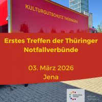 Der Kulturrat Thüringen e.V. lädt zu einem Vernetzungstreffen der Notfallverbünde und interessierter Kultureinrichtungen Thüringens ein. Ziel der Veranstaltung ist die Vernetzung der Notfallverbünde und der Erfahrungsaustausch mit Museen, Bibliotheken, Archiven und Feuerwehren.